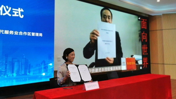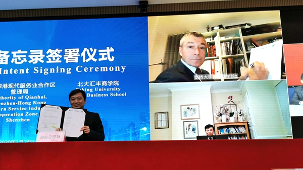 與以往不同,本次簽約儀式采用了現(xiàn)場簽約與視頻連線“云簽約”結(jié)合的特殊方式。前海管理局與中鐵建資本控股集團有限公司,與國研科工、彩虹魚,與北京大學(xué)匯豐商學(xué)院、劍橋大學(xué)嘉治商學(xué)院的合作采用了“云簽約”。
