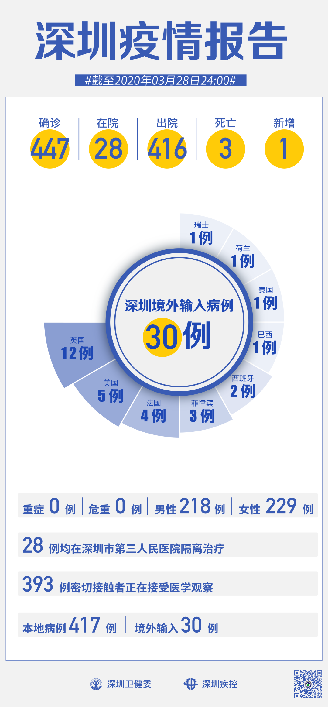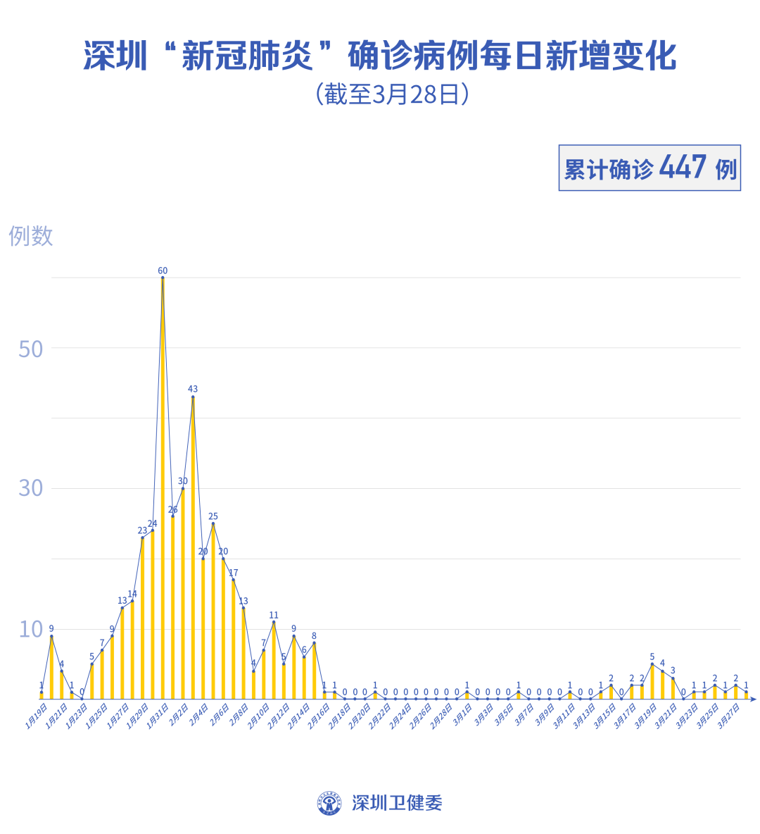 截至3月28日24時,深圳累計(jì)報(bào)告“新冠肺炎”病例447例。3月28日當(dāng)天新增1例。