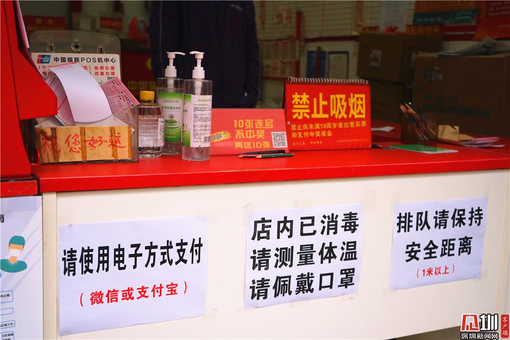 另一家在福田區(qū)華發(fā)北路,店號為83021044的投注站點,門口已經(jīng)被店員用桌子堵上,并貼上了相關(guān)防疫告示,“之前深圳福彩中心的工作人員來檢查過,后續(xù)也會給我們配送一些防護物資?!庇浾咴诖擞^察了30分鐘,期間僅有兩位彩民前來,共購買了8元彩票。店主馬先生向記者介紹,“以前大家都會來店里邊坐,主要買的是20分鐘開兩次的‘快樂彩’,現(xiàn)在都不給進來,那個彩票也暫停銷售了?!?nbsp;