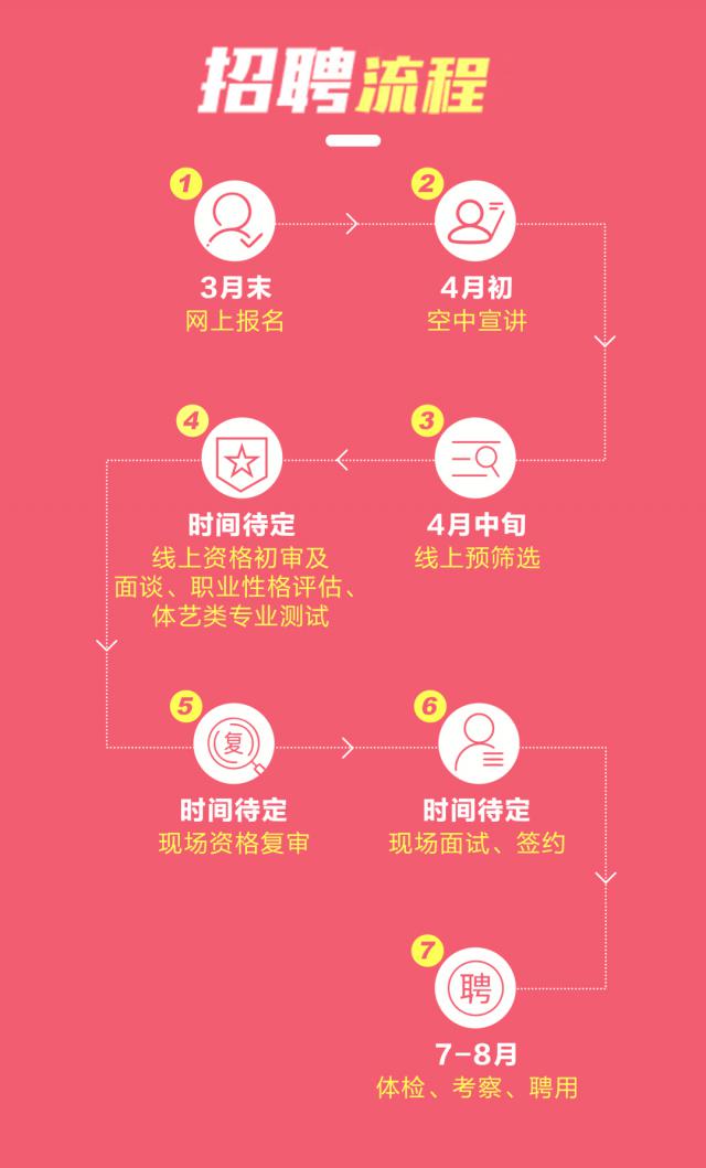 據(jù)悉,此次招聘將于3月末啟動網(wǎng)上報(bào)名,4月初進(jìn)行"空中"宣講,4月中旬進(jìn)行線上預(yù)篩選,此后還將有線上資格初審及面談、職業(yè)性格評估、體藝類專業(yè)測試、現(xiàn)場資格復(fù)審等環(huán)節(jié),錄用者將于7至8月進(jìn)行體檢、考察聘用。