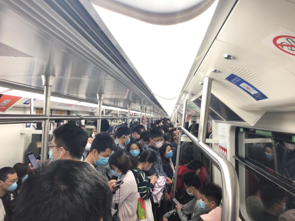 7點(diǎn)30分,深晚另一路記者從五號線長龍站進(jìn)站,進(jìn)站較順利沒有排長隊(duì),但是車上較擁擠,沒有座位。到達(dá)深圳北站后,在轉(zhuǎn)4號線去民樂站時排起了長隊(duì),大概等了13分鐘,才勉強(qiáng)擠進(jìn)4號線,車上幾乎沒有空間,身體無法動彈。8點(diǎn)17分從民樂出站,連同排隊(duì)等車,9站地鐵一共用時近50分鐘。