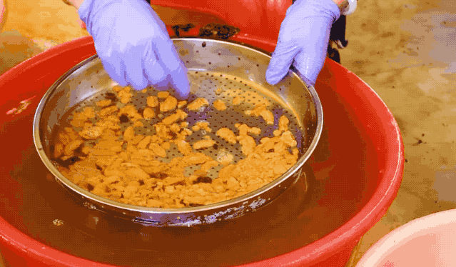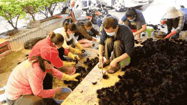 記者來到大鵬新區(qū)南澳海港路的潤成海膽專賣店,看到工人們上下飛舞著鐵鉤“挖海膽”。南澳本地人口中所謂“挖海膽”就是海膽加工,打開海膽殼,把海膽肉取出來,然后用海水清洗干凈。從捕撈到上岸加工處理都必須一天之內(nèi)完成,只有嚴守時間的把控,爭分奪秒才配擁有鮮美和誘人的口感。