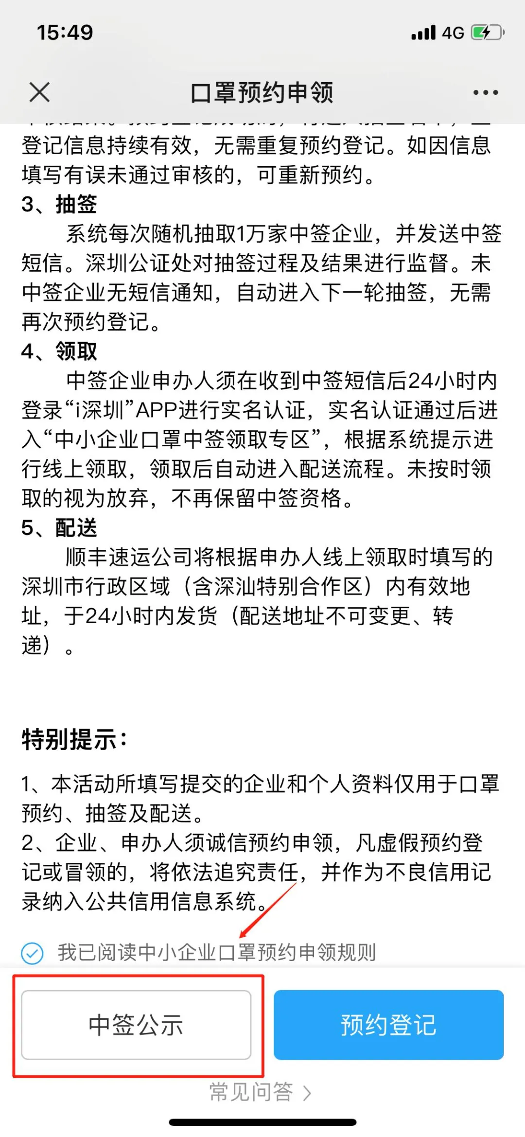 企業(yè)中簽名單:在“i深圳”微信公眾號(hào)首頁(yè)-口罩預(yù)約-中小企業(yè)專(zhuān)區(qū)頁(yè)面的下方“中簽公示”查看