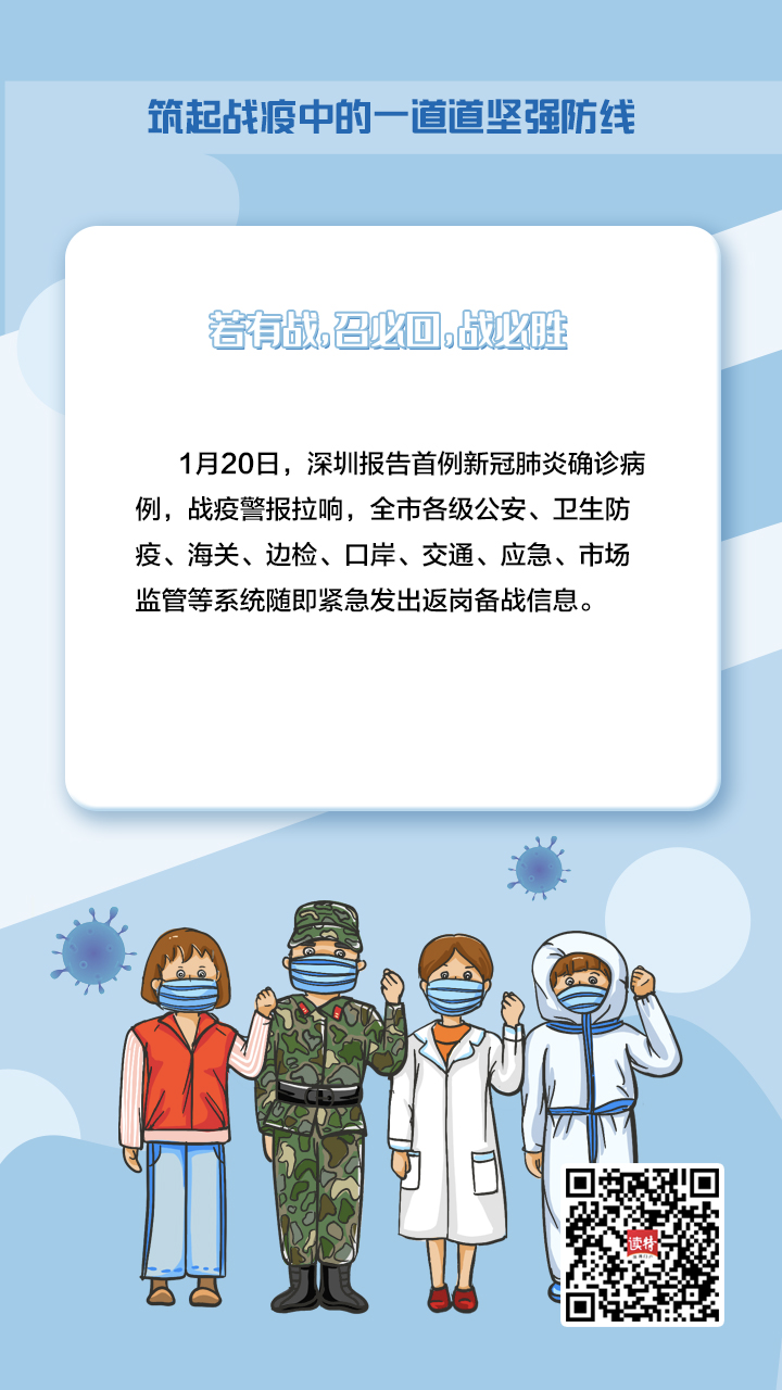 “在深圳的各位同事請(qǐng)立即返崗。各單位請(qǐng)馬上通知休假人員,落實(shí)人員歸隊(duì)?!?月20日,深圳報(bào)告首例新冠肺炎確診病例,戰(zhàn)疫警報(bào)拉響,全市各級(jí)公安、衛(wèi)生防疫、海關(guān)、邊檢、口岸、交通、應(yīng)急、市場(chǎng)監(jiān)管等系統(tǒng)隨即緊急發(fā)出返崗備戰(zhàn)信息。