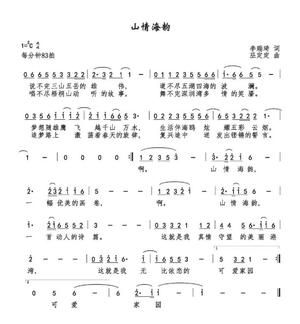《山情海韻》歌詞大氣,飽含深情。作者以詩(shī)一般的語(yǔ)言為我們描繪了一幅幅優(yōu)美多姿的畫面,詮釋了深圳從一個(gè)小漁村發(fā)展成繁華大都市的壯闊景象,展現(xiàn)了年輕一代充滿活力、努力奮斗、只爭(zhēng)朝夕的精神面貌,催人奮進(jìn)。