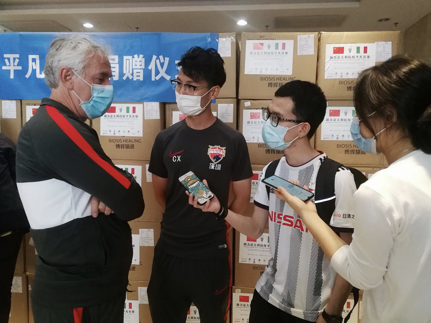 “感謝深圳。”當天,AC米蘭俱樂部前教練、深圳佳兆業(yè)足球隊主教練多納多尼作為在深意大利人代表也來到了活動現(xiàn)場。他表示,來深圳不到一年,已經(jīng)深刻感受到深圳的城市魅力?!爸袊谶@次抗擊疫情的過程中表現(xiàn)完美,每個人的一舉一動不僅是為自己,更是為別人,這非常令我感動。此次捐贈對于意大利來說十分重要,我代表我的祖國向大家表示由衷的感謝。”多納多尼在現(xiàn)場動情地說。(記者 許舜鈿)