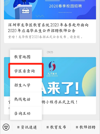 學(xué)區(qū)房鎖定情況可通過(guò)“龍華教育”微信公眾號(hào)—“資訊速遞”—“學(xué)區(qū)房查詢”自助查詢。查詢操作如下: