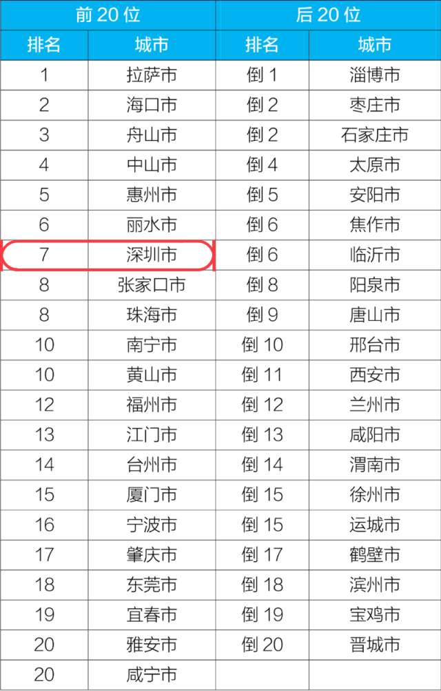 3月,168個重點城市中淄博、棗莊、石家莊市等城市空氣質量相對較差(從倒數第1名至倒數第20名);拉薩、海口、舟山市等城市空氣質量相對較好,深圳排名第7。
