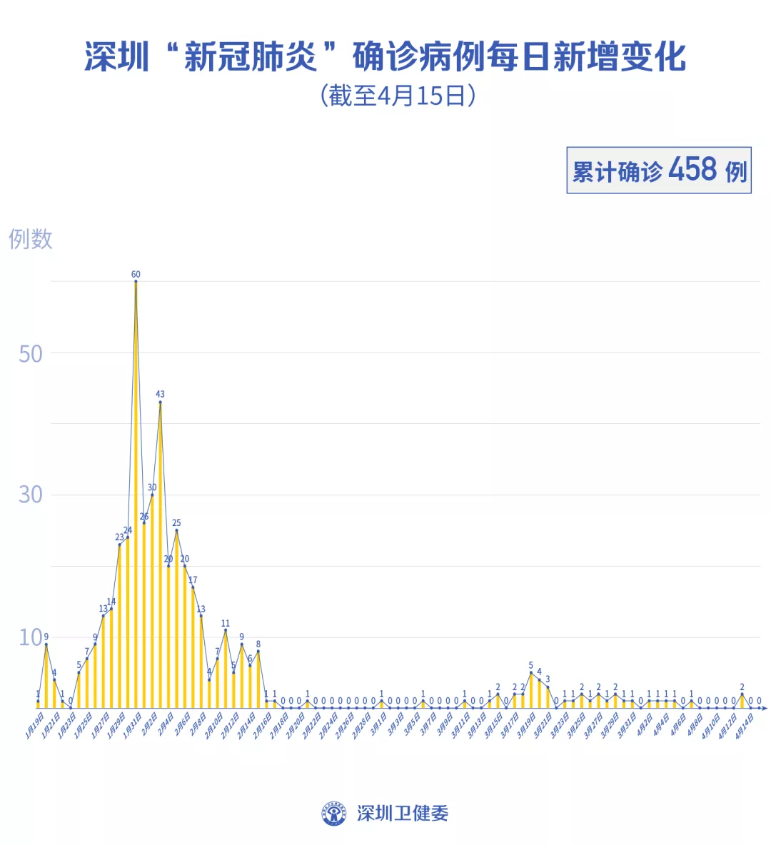 截至4月15日24時,深圳累計報告新冠肺炎病例458例。4月15日當(dāng)天新增出院2例。