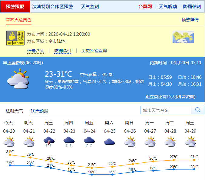 見圳客戶端·深圳新聞網(wǎng)2020年4月20日訊 市氣象局預(yù)計(jì)周一至周二(20-21日)多云暖濕,早晚有(輕)霧,氣溫23-30℃;周三(22日)轉(zhuǎn)雷雨;周四至周五(23-24日)持續(xù)陰雨,天氣轉(zhuǎn)陰涼,最低氣溫16℃;周末(25-26日)多云,氣溫開始回升。