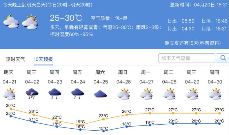 見(jiàn)圳客戶端·深圳新聞網(wǎng)2020年4月20日訊(見(jiàn)圳客戶端、深圳新聞網(wǎng)記者 陳婕)深圳20日最高氣溫30℃以上,其中龍崗區(qū)坪西站記錄到33.9℃的全市最高氣溫,可以說(shuō)擁有了標(biāo)配的“夏季氣溫”,但冷空氣已帶著“空調(diào)”在路上了,預(yù)計(jì)22日抵達(dá)深圳,所以外套、厚被子先別急著收!