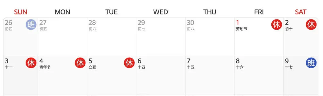“五一”小長(zhǎng)假即將到來(lái),4月26日(本周日)5月9日(下下周六)要上班!