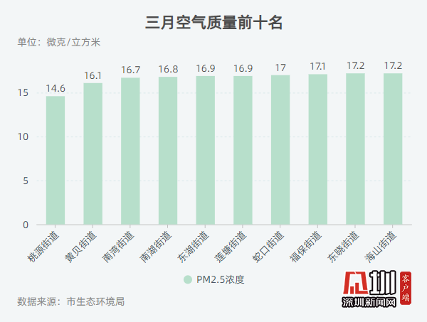 記者從深圳市生態(tài)環(huán)境局獲悉,2020年3月,全市74個(gè)街道PM2.5濃度在14.6-24.3微克/立方米之間,均值為19.0微克/立方米。