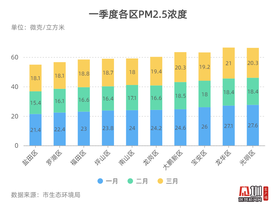 各區(qū)PM2.5平均濃度在18.0-21.0微克/立方米之間,濃度較低的有南山區(qū)、羅湖區(qū)和鹽田區(qū),濃度較高的有龍華區(qū)、光明區(qū)和大鵬新區(qū)。