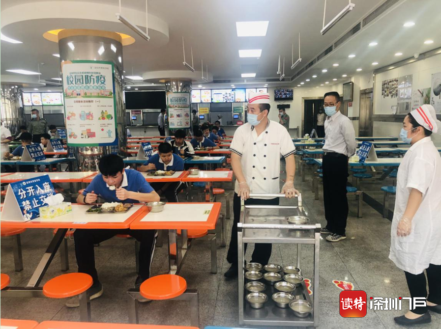 為保障疫情防控期間學(xué)生的用餐安全,羅湖高級(jí)中學(xué)采用“送餐制”,將午餐盒飯送餐到班,學(xué)生在餐前按七步法洗手后,依次在班級(jí)門口領(lǐng)餐后回到座位就餐。