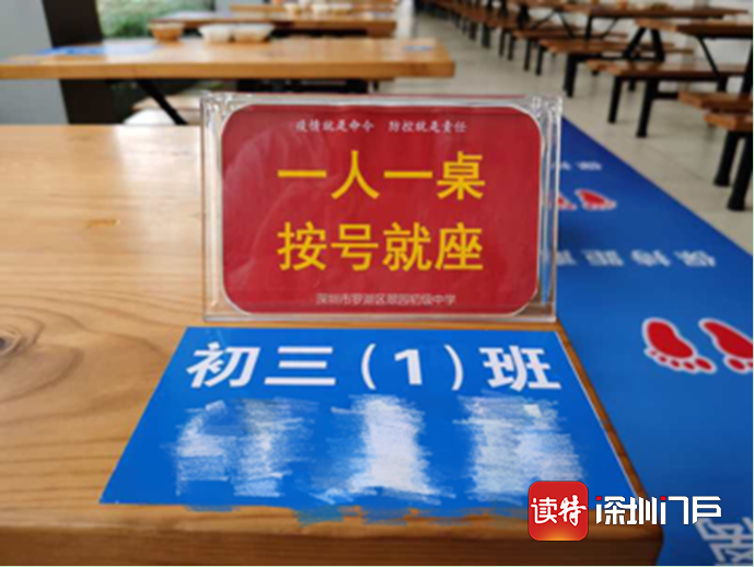 午餐期間,翠園初級(jí)中學(xué)在食堂的每張桌上貼有學(xué)生班級(jí)和姓名,一桌一人。就餐期間,學(xué)生有序就座。