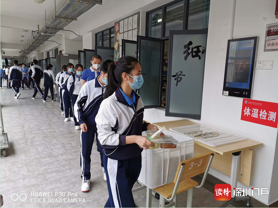 為保障疫情防控期間學(xué)生的用餐安全,羅湖高級(jí)中學(xué)采用“送餐制”,將午餐盒飯送餐到班,學(xué)生在餐前按七步法洗手后,依次在班級(jí)門(mén)口領(lǐng)餐后回到座位就餐。