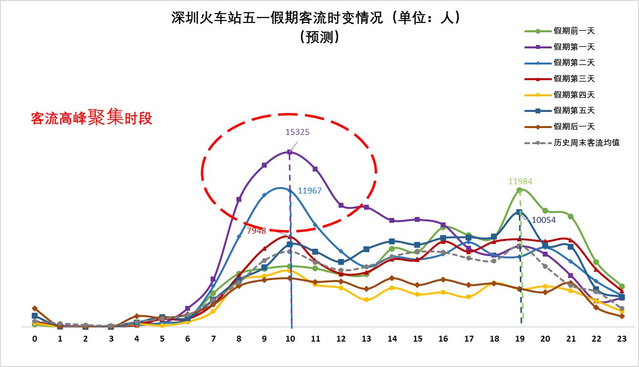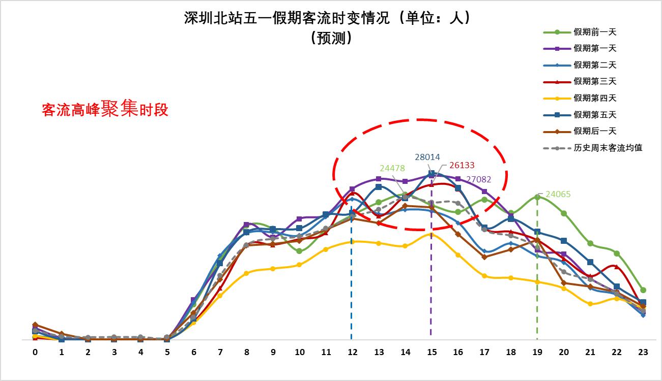 ▲預(yù)計深圳北站4月30日(假期前一天)晚間時段較易出現(xiàn)當(dāng)日客流高峰;五一假期期間12:00后較易出現(xiàn)當(dāng)日客流高峰。