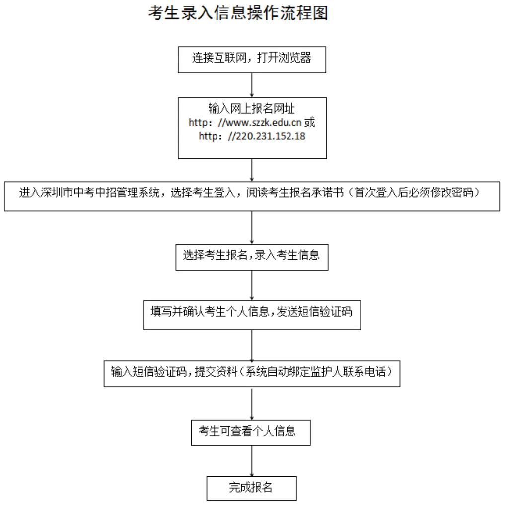 見(jiàn)圳客戶(hù)端·深圳新聞網(wǎng)2020年4月30日訊 據(jù)深圳市教育局消息,2020年深圳高中階段學(xué)校招生考試(以下簡(jiǎn)稱(chēng)“中考”)報(bào)名定于5月6日-15日進(jìn)行,考試時(shí)間為7月20日-21日。 今年本市應(yīng)屆初中畢業(yè)生仍繼續(xù)在就讀學(xué)校集體辦理報(bào)名手續(xù)。符合深圳中考報(bào)名條件的深圳戶(hù)籍往屆生、在市外就讀的深圳戶(hù)籍應(yīng)屆初中畢業(yè)生(以下簡(jiǎn)稱(chēng)“社會(huì)類(lèi)考生”)采用網(wǎng)上報(bào)名方式進(jìn)行報(bào)名。 報(bào)名條件 一、具有我市戶(hù)籍的初中畢業(yè)生,可以在我市報(bào)名參加中考。 二、具有我市初三學(xué)籍的隨遷子女可以報(bào)名參加中考,同時(shí)符合以下條件的,可以參加相應(yīng)的公辦普高、民辦普高和中職學(xué)校的劃線(xiàn)錄取。 (一)父親或母親在我市具有合法穩(wěn)定職業(yè); (二)父親或母親在我市具有合法穩(wěn)定住所; (三)父親或母親持有有效《深圳經(jīng)濟(jì)特區(qū)居住證》; (四)父親或母親在我市繳納基本養(yǎng)老保險(xiǎn)及基本醫(yī)療保險(xiǎn),且至少其中一個(gè)險(xiǎn)種累計(jì)繳費(fèi)滿(mǎn)3年,社保累計(jì)年限計(jì)算截至2020年8月31日; (五)隨遷子女在我市具有3年完整初中學(xué)籍。 不符合上述條件但具有我市初中學(xué)籍的隨遷子女,可以在我市參加中考,但僅限于參加民辦普高補(bǔ)錄或中職學(xué)校注冊(cè)入學(xué)。 三、高中階段學(xué)校在校生不得報(bào)名。 本市應(yīng)屆初中畢業(yè)生報(bào)名辦法 本市應(yīng)屆初中畢業(yè)生于5月6日至7日在就讀學(xué)校集體辦理報(bào)名手續(xù)。 今年中考繼續(xù)實(shí)行網(wǎng)上報(bào)名。要求各學(xué)校開(kāi)放計(jì)算機(jī)房,為本??忌暇W(wǎng)報(bào)名提供方便。 5月8日至15日,學(xué)校組織考生進(jìn)行電子攝像,學(xué)校和考生分別上網(wǎng)錄入報(bào)名信息,考生錄入信息可參考“考生錄入信息流程圖”進(jìn)行操作。 市教育局強(qiáng)調(diào),學(xué)校不得以任何理由拒絕有本校學(xué)籍的應(yīng)屆畢業(yè)生報(bào)考(參加中職學(xué)校自主招生、注冊(cè)入學(xué)的考生,也須報(bào)名參加中考)。如有違反者,將嚴(yán)肅查處,并追究相關(guān)人員責(zé)任。同時(shí)要求各區(qū)有關(guān)職能部門(mén)、各有關(guān)學(xué)校(報(bào)名點(diǎn))要嚴(yán)格審查報(bào)名材料。對(duì)不符合報(bào)名條件、弄虛作假而被錄取的考生,一經(jīng)發(fā)現(xiàn),取消其錄取資格;已經(jīng)到錄取學(xué)校報(bào)到注冊(cè)的,取消其學(xué)籍,并追究相關(guān)人員責(zé)任。 社會(huì)類(lèi)考生報(bào)名辦法 社會(huì)類(lèi)考生采用網(wǎng)上報(bào)名方式進(jìn)行報(bào)名。報(bào)名考生需在5月6日至15日登錄報(bào)名網(wǎng)址(http://www.szzk.edu.cn/),按照提示進(jìn)行網(wǎng)上注冊(cè),上傳報(bào)名審核資料,由考生戶(hù)籍所在區(qū)社會(huì)報(bào)名點(diǎn)進(jìn)行線(xiàn)上審核,審核通過(guò)后系統(tǒng)將生成中考考生號(hào)及初始密碼,考生需用獲取的考號(hào)及密碼登錄中考中招管理系統(tǒng),填寫(xiě)個(gè)人信息,具體操作可參考“考生錄入信息流程圖”。同時(shí)需在報(bào)名截止前根據(jù)指引完成網(wǎng)上繳費(fèi)。 若考生網(wǎng)上報(bào)名審核不通過(guò),需按照系統(tǒng)的不通過(guò)原因提示,重新補(bǔ)充審核資料,如多次上傳資料失敗或?qū)徍瞬煌ㄟ^(guò),考生可撥打戶(hù)籍所在區(qū)的社會(huì)報(bào)名點(diǎn)電話(huà)進(jìn)行咨詢(xún)或電話(huà)預(yù)約,按照工作人員指示進(jìn)行操作報(bào)名,不要在未預(yù)約的情況下前往社會(huì)報(bào)名點(diǎn),盡量避免出行,減少人員聚集。 社會(huì)類(lèi)考生操作流程如下圖: 考生錄入信息操作流程如下圖: 中考社會(huì)報(bào)名點(diǎn)一覽表 深圳各類(lèi)考生具體報(bào)考范圍、各類(lèi)升學(xué)資格申報(bào)所需條件和材料以及相關(guān)報(bào)名要求,考生可通過(guò)深圳市招生考試辦公室官網(wǎng)(zkb.sz.gov.cn)及官方微信公眾號(hào)(深圳市招生考試辦公室)查閱,市招考辦也將第一時(shí)間通過(guò)上述渠道發(fā)布各類(lèi)中考資訊。