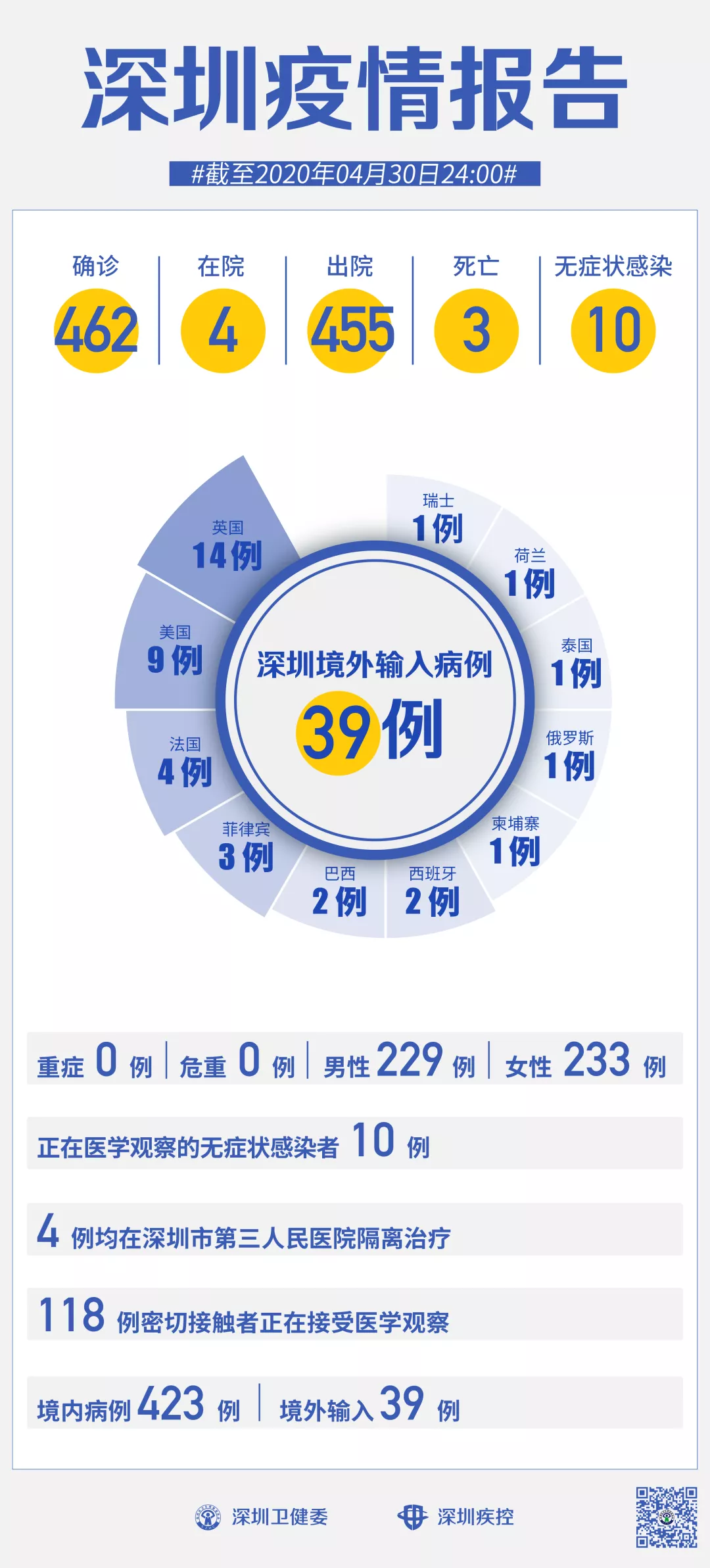 截至4月30日24時(shí),深圳累計(jì)報(bào)告新冠肺炎病例462例。4月30日當(dāng)天新增無(wú)癥狀感染者2例,出院1例。