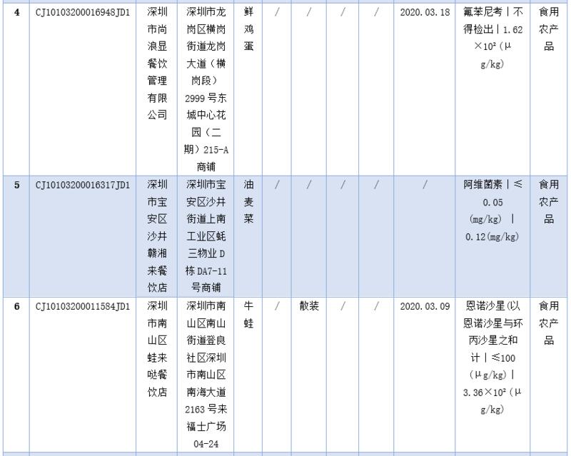在不合格食品中,記者注意到,深圳市尚浪顯餐飲管理有限公司的鮮雞蛋及深圳市大汗食品有限公司的雞蛋均檢出氟苯尼考。據(jù)悉,氟苯尼考又稱氟甲砜霉素,是農(nóng)業(yè)部批準(zhǔn)使用的動物專用抗菌藥,主要用于敏感細(xì)菌所致的豬、雞、魚的細(xì)菌性疾病?!秳游镄允称分蝎F藥最高殘留限量》中規(guī)定,氟苯尼考可用于豬、牛、羊、禽、魚等,在產(chǎn)蛋家禽中禁用(雞蛋、鵝蛋中不得檢出)。正常情況下消費(fèi)者不必對雞蛋、鵝蛋中檢出氟苯尼考過于擔(dān)心,但長期食用氟苯尼考?xì)埩舫瑯?biāo)的蛋品,對人體健康有一定風(fēng)險(xiǎn)。