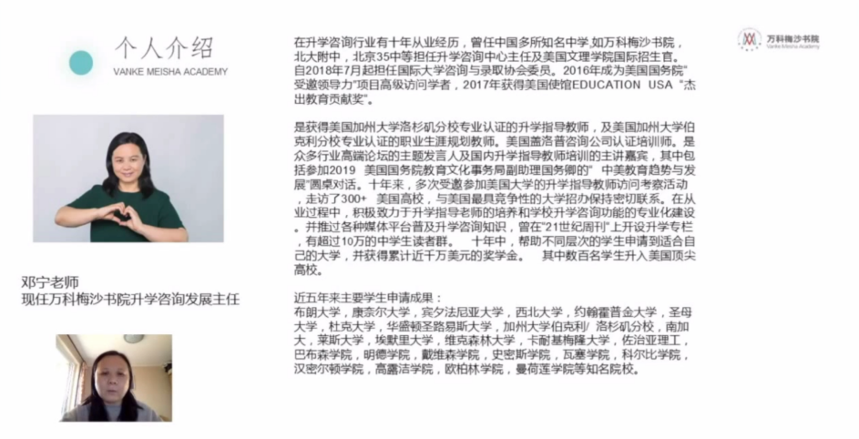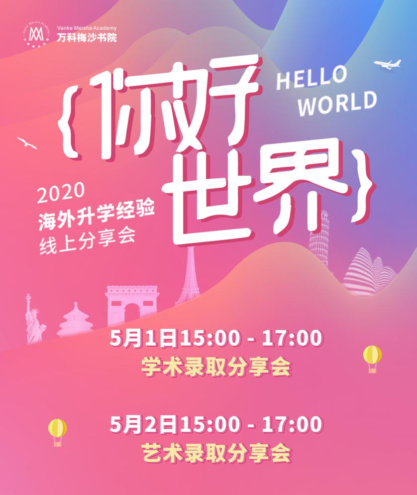 萬(wàn)科梅沙書(shū)院2020“你好,世界”海外升學(xué)經(jīng)驗(yàn)線上分享會(huì)分為學(xué)術(shù)專場(chǎng)、藝術(shù)專場(chǎng)進(jìn)行,10位梅沙優(yōu)秀畢業(yè)生、1位家長(zhǎng)代表、升學(xué)指導(dǎo)團(tuán)隊(duì)、藝術(shù)專業(yè)老師參與分享。