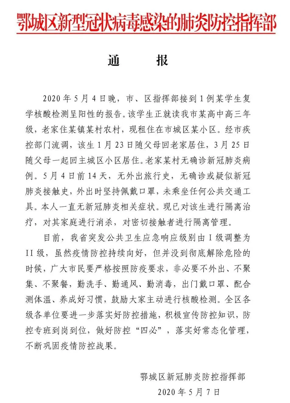 通報(bào)稱,5月4日晚,市、區(qū)指揮部接到1例某學(xué)生復(fù)學(xué)核酸檢測(cè)呈陽性的報(bào)告。該學(xué)生正就讀鄂州市某高中高三年級(jí),老家住某鎮(zhèn)某村農(nóng)村,現(xiàn)租住在市城區(qū)某小區(qū)。