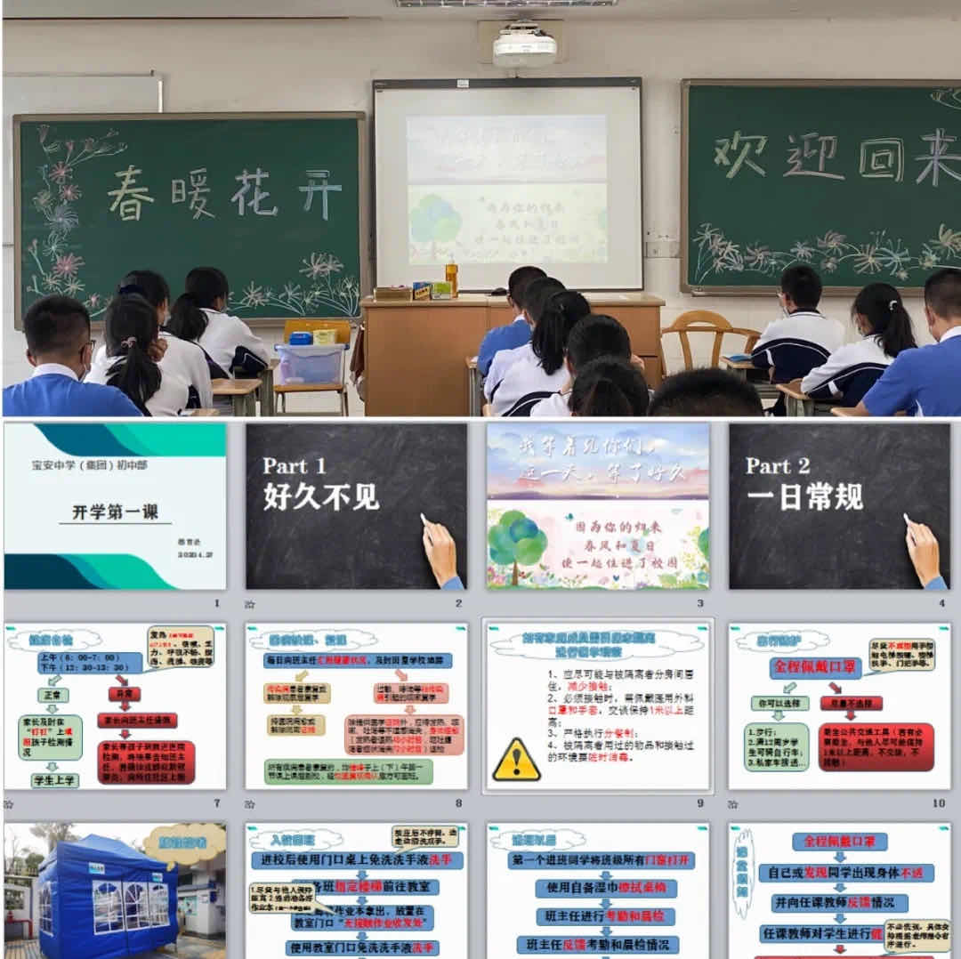 學校在校門外設立進入通道,讓學生按照提前設置好的路線指引, 分批分流 進入校園。學校課室的課桌擺放呈“一人一桌”制,樓道貼上站位地標,充分拉開學生安全間距離, 少交談少聚集 。除此之外,學校通過取消課間操、眼操等方式壓縮課間,實現(xiàn) 錯峰放學 。各班門前設置無接觸交作業(yè)區(qū),放置免洗洗手液,另外還特地為學生發(fā)放常規(guī)指引小冊子,制作了《寶安中學(集團)2020年春季學期返校復學指引》手繪視頻,開設了以防疫為主要內(nèi)容的“開學第一課”,讓防疫知識 入耳入腦入心 。