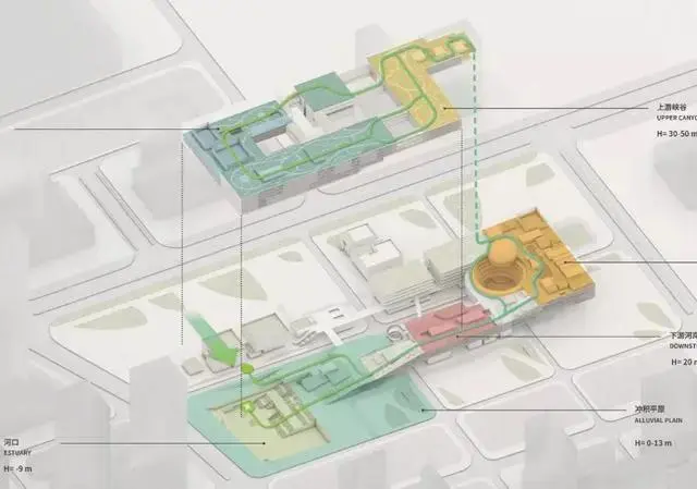 產(chǎn)業(yè)生態(tài)雨林的三個層級都可經(jīng)由一個城市公園的多層級通道系統(tǒng)抵達(dá),仿佛曲折蜿蜒的河水流過緩坡。