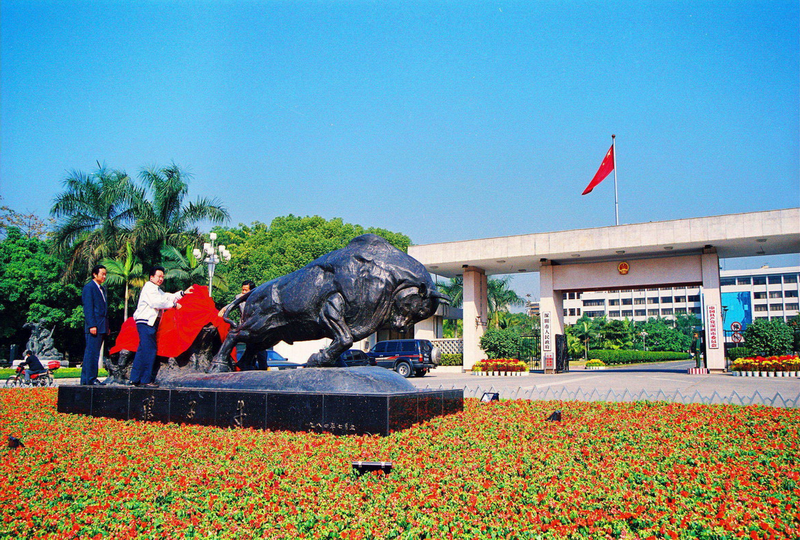 在深南大道,深圳市委大院門前,有一座深圳人最熟悉的銅雕——“孺子?!钡袼?,也有人稱它為“拓荒?!?。它重4噸、長5.6米、高2米、基座高1.2米、以花崗石磨光石片為底座;牛頭抵地,四腿后蹬,全身緊繃,肌肉線條極具張力,給人竭盡全力的負重感;牛身后則拉起一堆腐朽樹根。這座銅雕造型鮮明地體現(xiàn)出深圳人勇于開拓、大膽創(chuàng)新、無私奉獻、奮勇前進的精神。