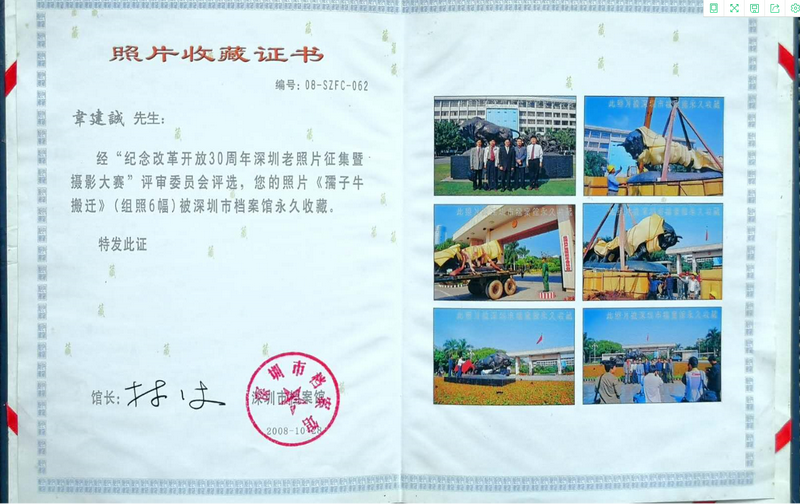 “一開始,我提出這個遷移建議時,還是有點忐忑的,后來得知‘孺子?!袼軐⒁浦潦形笤和夂?,我非常高興,這樣一來,跟‘孺子牛’合影就方便多了呀!”“孺子?!钡袼苓w移當天,韋建誠興奮地拿起相機,用鏡頭定格下整個搬遷過程?!澳且惶焓俏胰松铍y忘的日子之一,既是我44歲生日,又是‘孺子?!袼馨残录抑?。”回憶起當時的情況,韋建誠還是十分興奮。而韋建誠拍攝的組照后來被深圳市檔案館永久收藏。深圳市委辦公廳還將《市民希望將“孺子?!钡袼芤浦潦懈笤和狻吩u為一等獎。