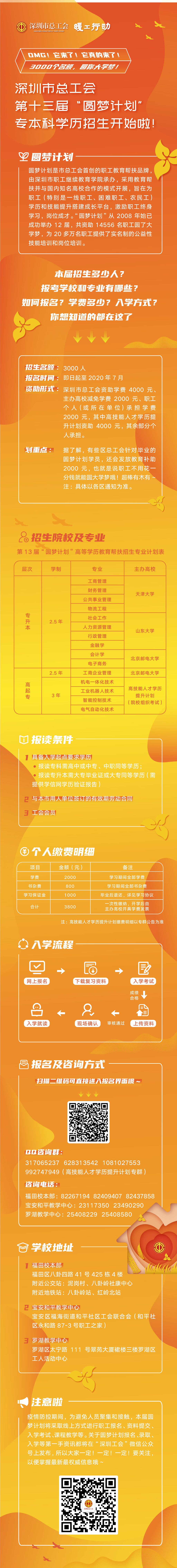 在疫情防控、復(fù)工復(fù)產(chǎn)的特殊形勢下,結(jié)合市總工會“暖工行動”相關(guān)要求,本屆“圓夢計劃”進(jìn)一步提高幫扶精準(zhǔn)性,向受疫情影響嚴(yán)重的企業(yè)和職工傾斜,推動企業(yè)和職工共擔(dān)責(zé)任、共克時艱,穩(wěn)定職工隊伍和就業(yè),努力做到職工多轉(zhuǎn)崗、少下崗、多就業(yè)、少失業(yè)。符合報名條件的職工可在“深圳工會”微信公眾號上進(jìn)行報名,報名截止日期為7月30日,主辦方將根據(jù)報名人數(shù)分期分批組織入學(xué)考試。入學(xué)考試采用“文化素養(yǎng)+職業(yè)技能+工作實(shí)績”的多元評價方式,在“文化素養(yǎng)”為主體考試中增加工會基本知識,提高職工工會意識。所有錄取學(xué)員將于今年9月入學(xué)就讀,進(jìn)行線上線下相結(jié)合的學(xué)習(xí),在規(guī)定學(xué)制內(nèi)修滿學(xué)分將獲得各高校頒發(fā)、國家承認(rèn)的畢業(yè)證書。