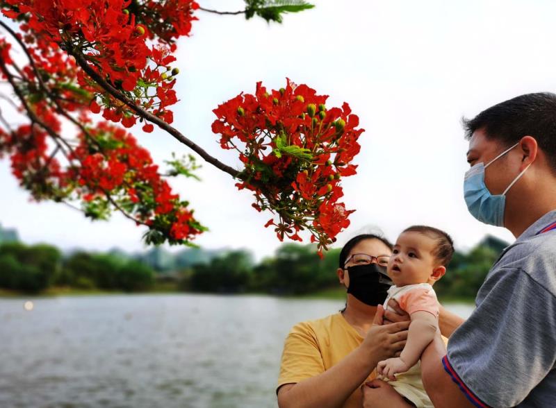 鳳凰木又名火樹、紅花楹,由于其開花時"葉如飛凰之羽,花若丹鳳之冠",因而得名「鳳凰樹」。每年5月至7月,是鳳凰樹開花的時節(jié)。在鵬城公園、道路兩旁到處可見鳳凰花盛開,當(dāng)下鳳凰花開正燦爛,錦簇花團紅似火,成為鵬城亮麗的風(fēng)景線。圖為龍崗大運中心鳳凰樹花開吸引市觀賞拍照。