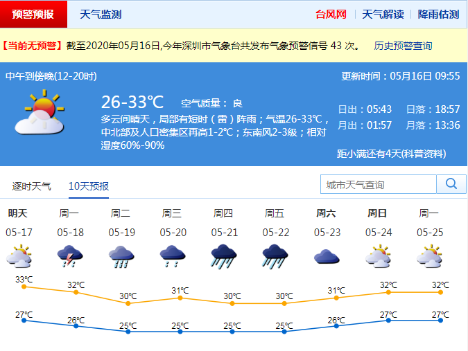 見圳客戶端·深圳新聞網(wǎng)2020年5月16日訊 深圳市氣象臺預報,周末天氣悶熱局部有短時(雷)陣雨下周轉趨多降雨天氣:周末期間(16-17日)多云間晴天,天氣悶熱,局部地區(qū)有短時(雷)陣雨,氣溫27-33℃,中北部最高氣溫可達35℃左右;下周轉趨多降雨天氣,其中18-19日有中到大雨局部暴雨,伴有短時強降雨、短時大風。