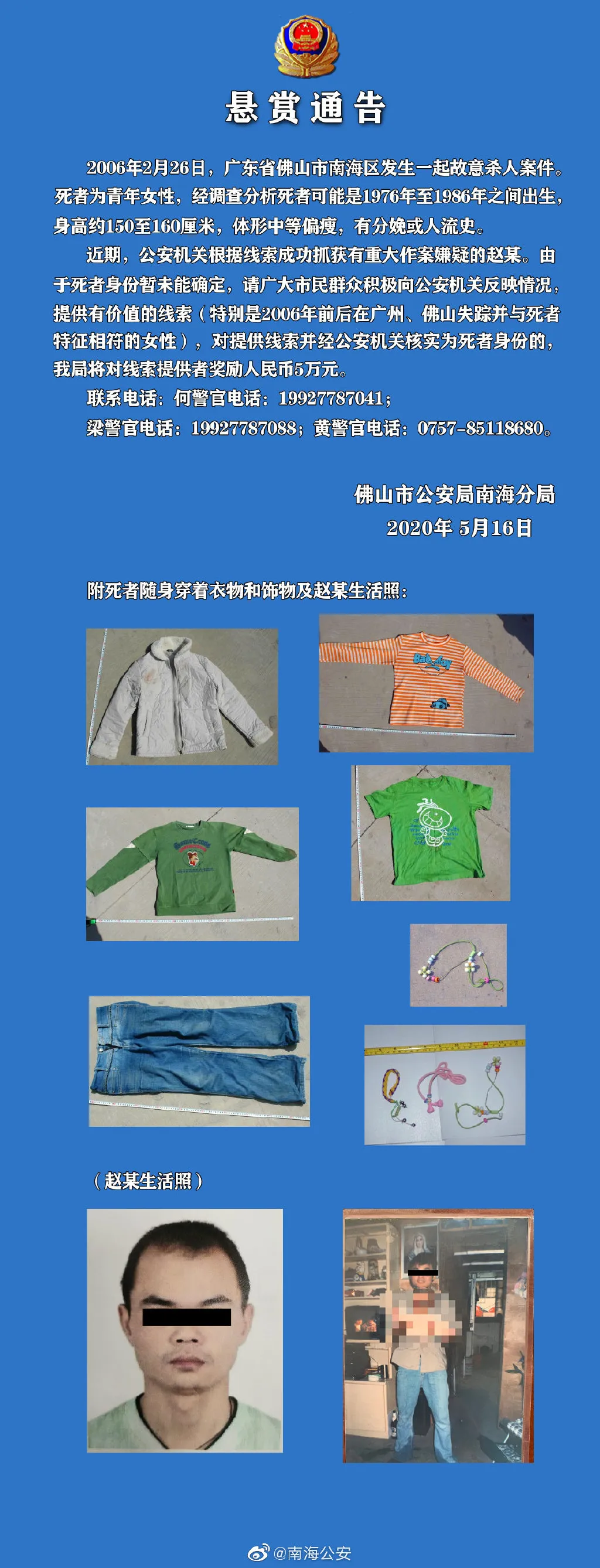 近期,公安機關(guān)根據(jù)線索成功抓獲有重大作案嫌疑的趙某。由于死者身份暫未能確定,請廣大市民群眾積極向公安機關(guān)反映情況,提供有價值的線索(特別是2006年前后在廣州、佛山失蹤并與死者特征相符的女性),對提供線索并經(jīng)公安機關(guān)核實為死者身份的,將對線索提供者獎勵人民幣5萬元。
