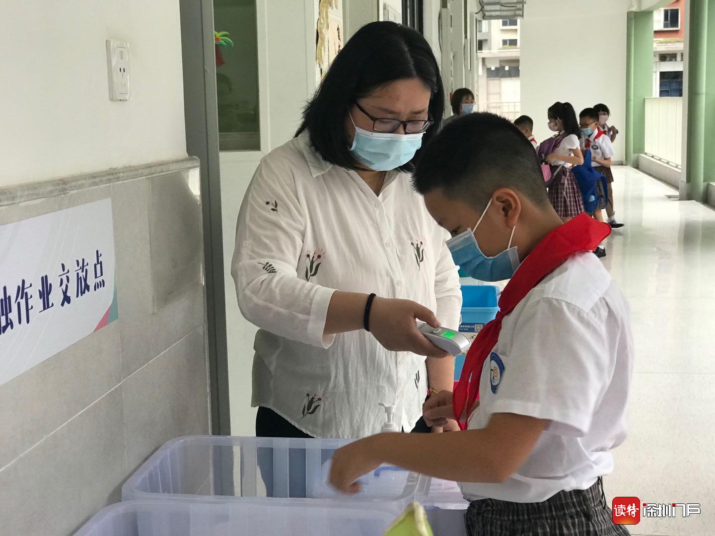 “同學(xué)們早上好!”“老師們好!”18日一大早,龍華區(qū)和平實(shí)驗(yàn)小學(xué)的老師們都早早做好準(zhǔn)備,站在學(xué)校門口,迎接孩子們歸來。在各班教室門口,學(xué)校還貼心的準(zhǔn)備了“無接觸作業(yè)交站點(diǎn)”,同學(xué)們按順序自覺將學(xué)科作業(yè)放進(jìn)箱內(nèi),減少了不必要的接觸。(讀特記者何亞南)