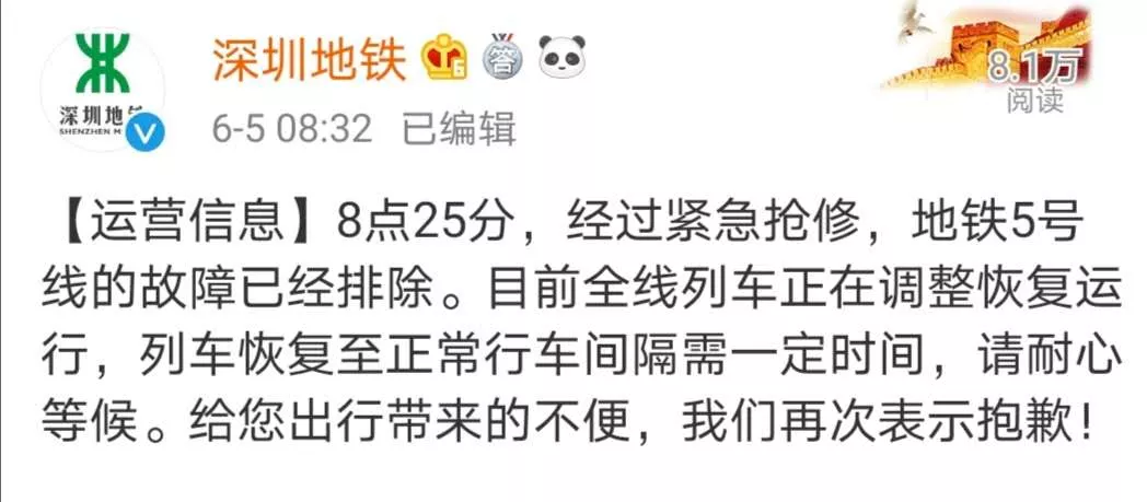 @深圳地鐵發(fā)布信息:8點(diǎn)25分,經(jīng)過(guò)緊急搶修地鐵5號(hào)線的故障已經(jīng)排除。目前全線列車正在調(diào)整恢復(fù)運(yùn)行。
