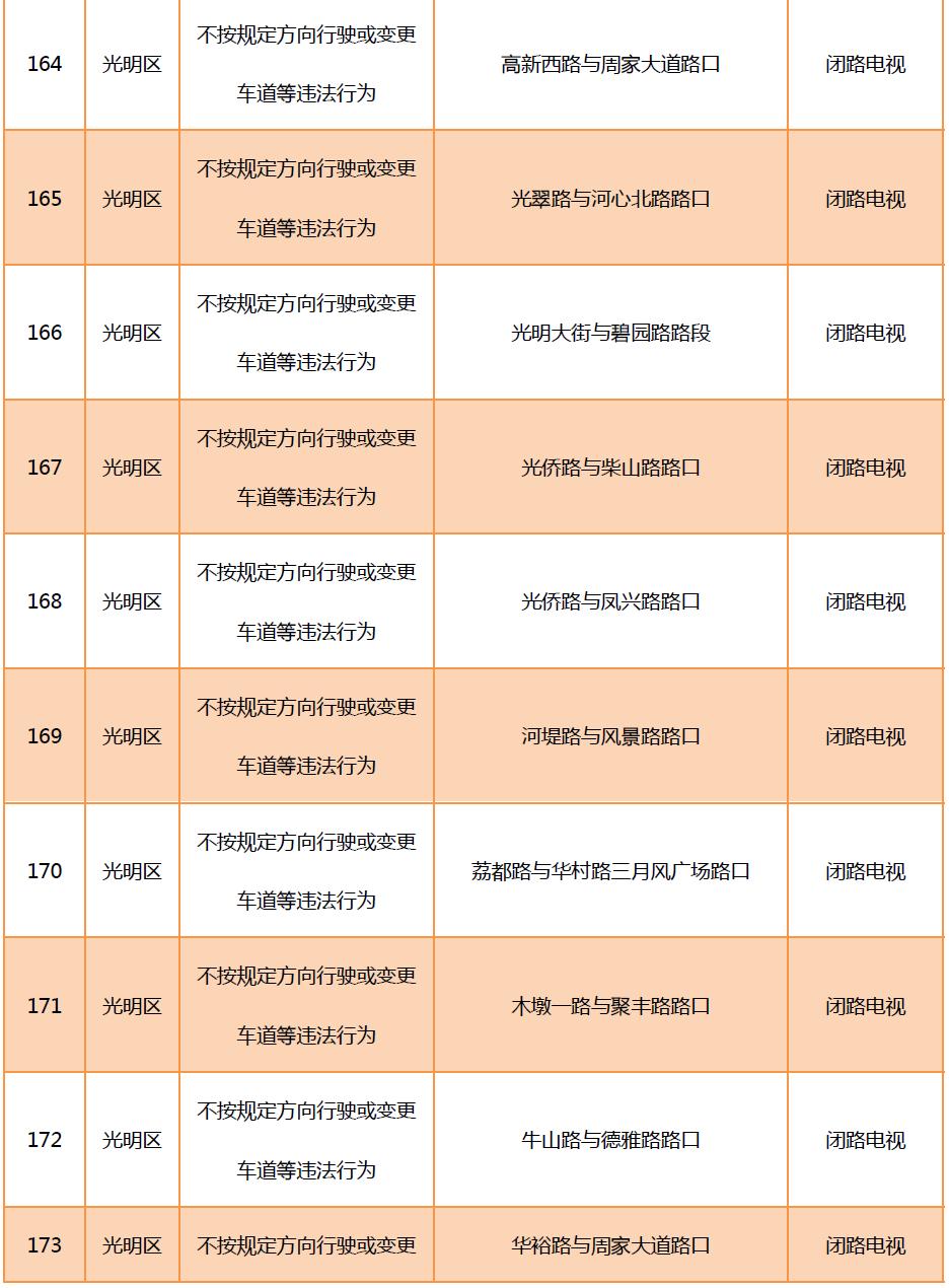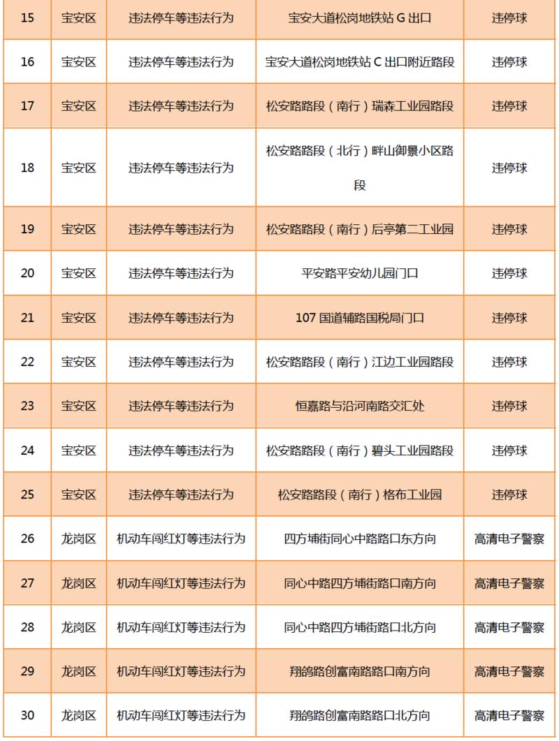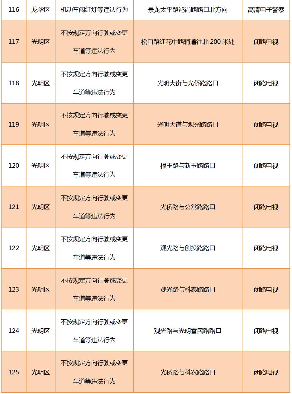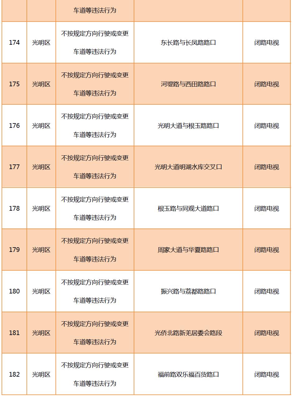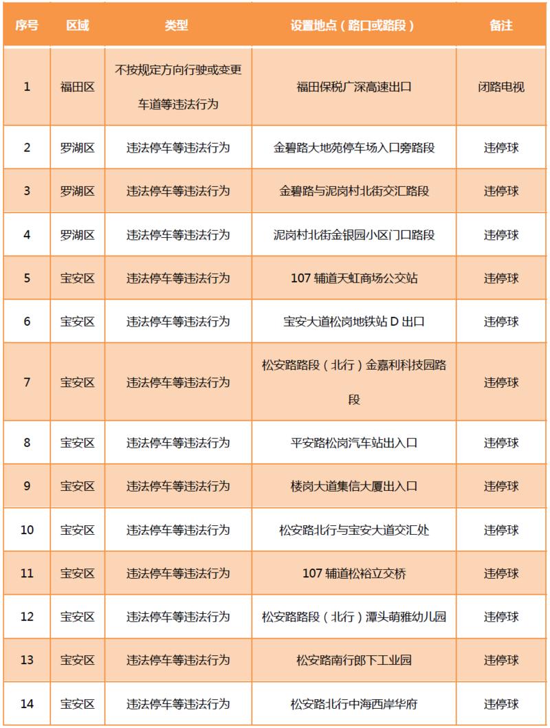 見圳客戶端?深圳新聞網(wǎng)2020年6月9日訊(晶報記者 鄧裴裴)6月9月,深圳市公安局交通警察局發(fā)布關(guān)于公布啟用190套交通技術(shù)監(jiān)控設(shè)備的公告,在福田區(qū)、羅湖區(qū)、寶安區(qū)、龍崗區(qū)、光明區(qū)啟用合計190套交通技術(shù)監(jiān)控設(shè)備,其中包括閉路電視、違停球、高清電子警察,類型為不按規(guī)定方向行駛或變更車道等違法行為和機動車闖紅燈等違法行為。
