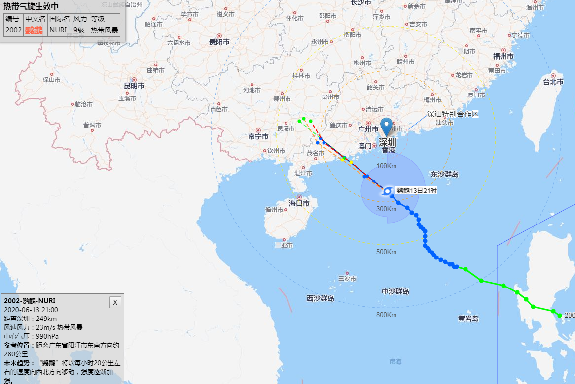 6月13日12時臺風“鸚鵡”(熱帶風暴級)位于深圳市東南方大約446公里的海面上,中心附近最大風力8級。未來24小時趨向江門至茂名附近海域,最大可能在陽江附近登陸。我市13日17時前后起風力逐漸加大,13日夜間至14日上午為風雨主要影響時段。目前臺風藍色預警信號生效中。深圳市氣象臺2020年06月13日12時35分發(fā)布。