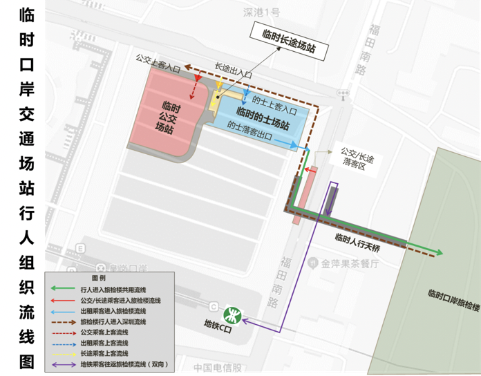 臨時(shí)口岸期間機(jī)動(dòng)車交通按照“流線順暢、客貨分離、人車分離”的原則進(jìn)行組織。主要利用口岸片區(qū)的皇崗路、百合路、福田南路、同慶路等進(jìn)行組織。各交通方式交通組織流線圖如下: