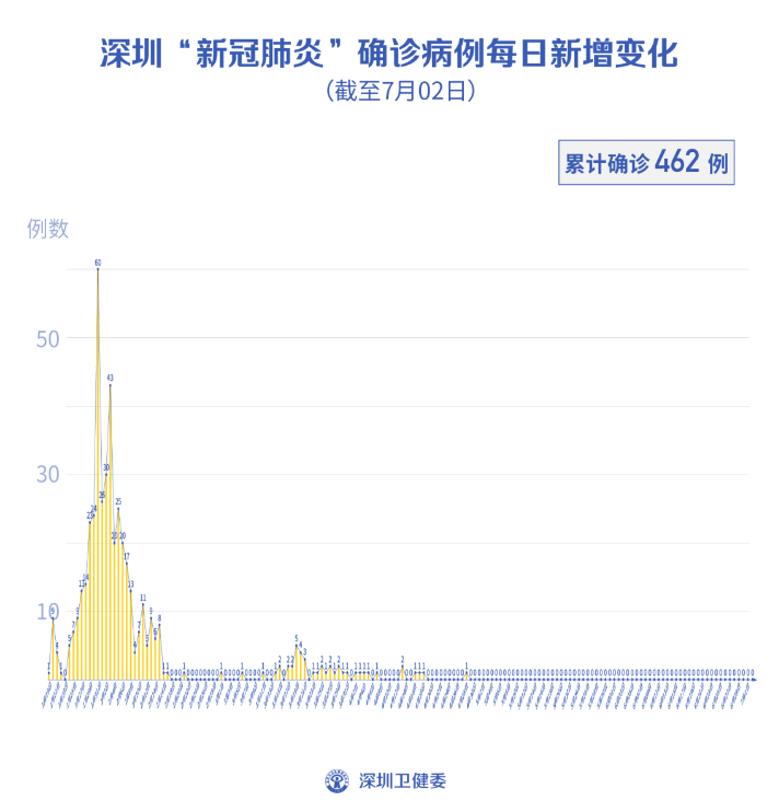 截至7月2日24時,深圳累計報告新冠肺炎病例462例。
