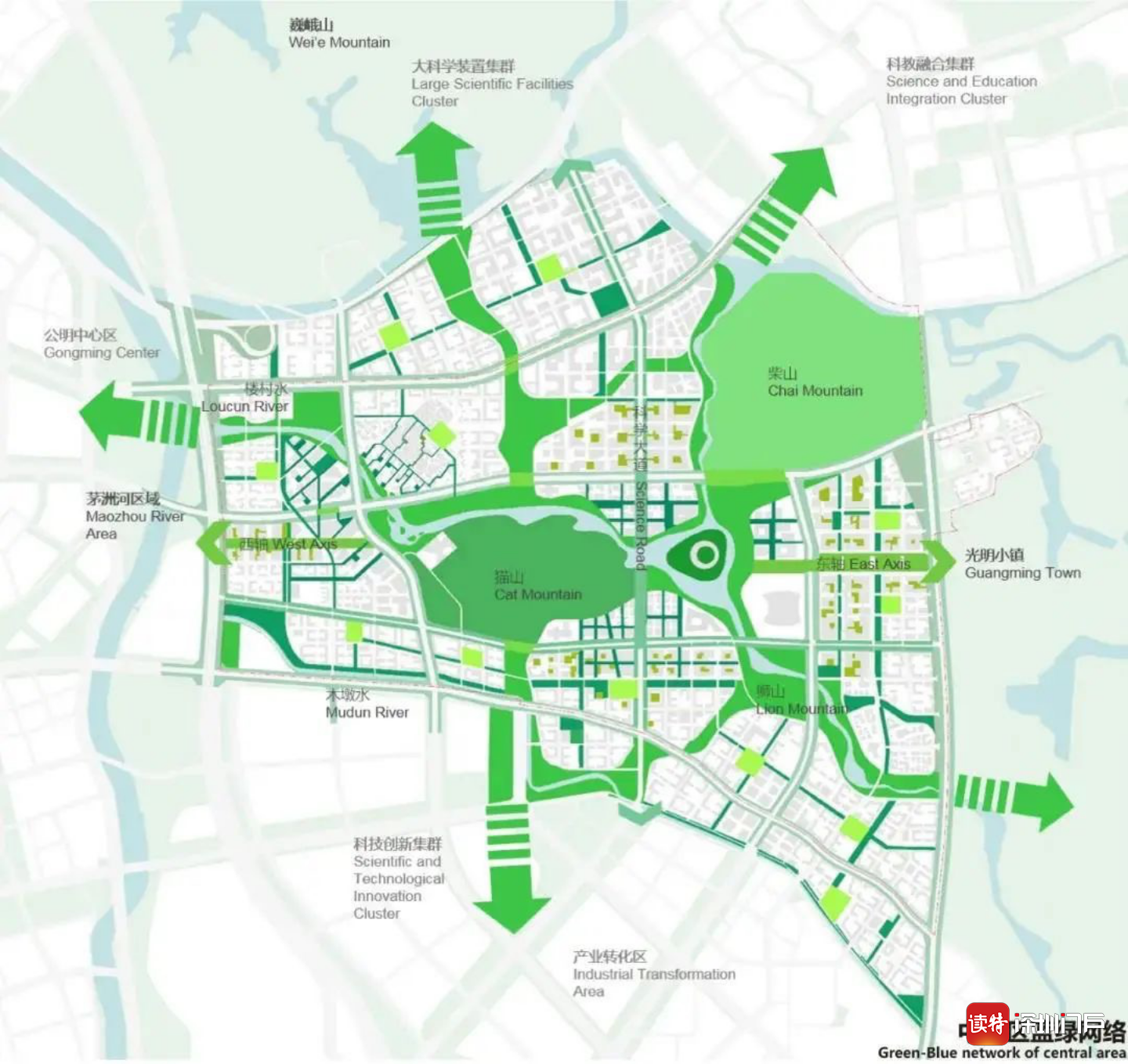 根據(jù)《綱要》,光明科學(xué)城規(guī)劃總面積99平方公里。構(gòu)建“一主兩副”的科學(xué)裝置集聚區(qū)空間布局,“一主”即大科學(xué)裝置集群,布局世界級(jí)大科學(xué)裝置及其衍生發(fā)展的空間保障,“兩副”即科教融合集群、科技創(chuàng)新集群,布局大科學(xué)裝置和高水平大學(xué)、產(chǎn)學(xué)研結(jié)合的科研機(jī)構(gòu)、共享實(shí)驗(yàn)室、產(chǎn)業(yè)轉(zhuǎn)化孵化平臺(tái)等科技創(chuàng)新設(shè)施。規(guī)劃“一心兩區(qū),綠環(huán)縈繞”的總體空間布局,“一心”即光明中心區(qū)提供優(yōu)質(zhì)公共服務(wù),“兩區(qū)”即裝置集聚區(qū)和產(chǎn)業(yè)轉(zhuǎn)化區(qū),“綠環(huán)縈繞”即科學(xué)城藍(lán)綠活力環(huán),提供高品質(zhì)生態(tài)環(huán)境和公共空間。突出“綠色風(fēng)、國(guó)際范、科技韻”,形成“北林、中城、南谷”差異化城市風(fēng)貌。依托深莞城際,深廣中軸城際,城市軌道等,提升國(guó)際交往便利度,強(qiáng)化與大灣區(qū)科創(chuàng)要素聯(lián)系。