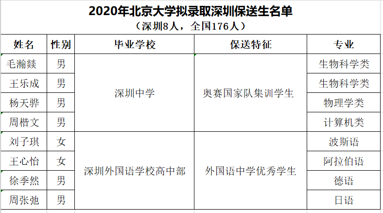2020年北京大學(xué)擬錄取深圳保送生名單