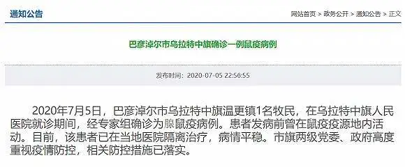 7月5日傍晚,內(nèi)蒙古巴彥淖爾市衛(wèi)生健康委員會發(fā)布通告稱,烏拉特中旗人民醫(yī)院報告了1例疑似腺鼠疫病例,經(jīng)研究決定,于7月5日發(fā)布鼠疫防控Ⅲ級預(yù)警。當(dāng)天晚間,巴彥淖爾市衛(wèi)生健康委員會再次發(fā)布通告稱,該市烏拉特中旗確診一例鼠疫病例。