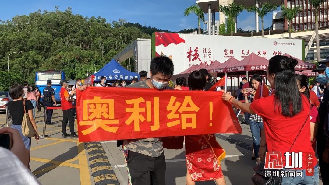 一名考生的學(xué)長(zhǎng)來(lái)到深圳紅嶺中學(xué)考點(diǎn)門口,為學(xué)弟舉起“奧利給”的旗子!