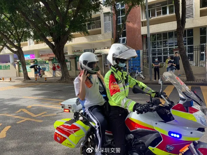 一考生遇早高峰擁堵,距離開考還有十分鐘,@深圳福田交警鐵騎搭載考生順利到達(dá)考場。