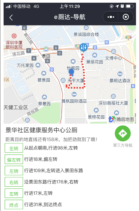 第三個(gè)功能為導(dǎo)航找?guī)?。既然已?jīng)查看到周邊有廁所分布,怎能不知道具體線路呢?“e廁達(dá)”中的“帶我去”按鈕可以輕松引領(lǐng)你去往定位的公廁。
