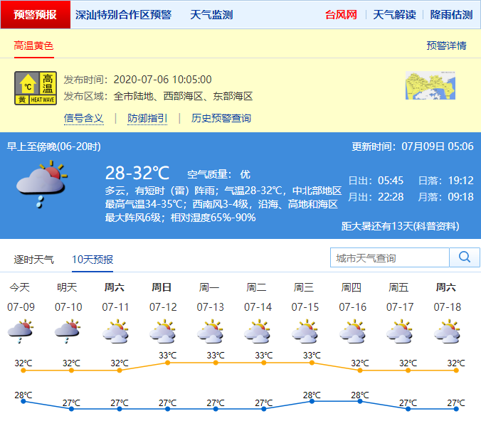 見圳客戶端?深圳新聞網(wǎng)2020年7月9日訊 根據(jù)深圳氣象局消息,深圳今日多云,有短時(雷)陣雨;氣溫28-32℃,中北部地區(qū)最高氣溫34-35℃;西南風3-4級,沿海、高地和海區(qū)最大陣風6級;相對濕度65%-90%。