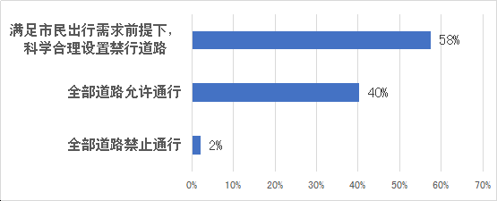 據(jù)調(diào)查,約58%的市民支持在滿足市民出行需求前提下,科學合理設(shè)置禁行道路;40%的市民認為應該全部道路允許電動二輪車通行;僅2%的市民認為電動二輪車應當在全部道路禁止通行。