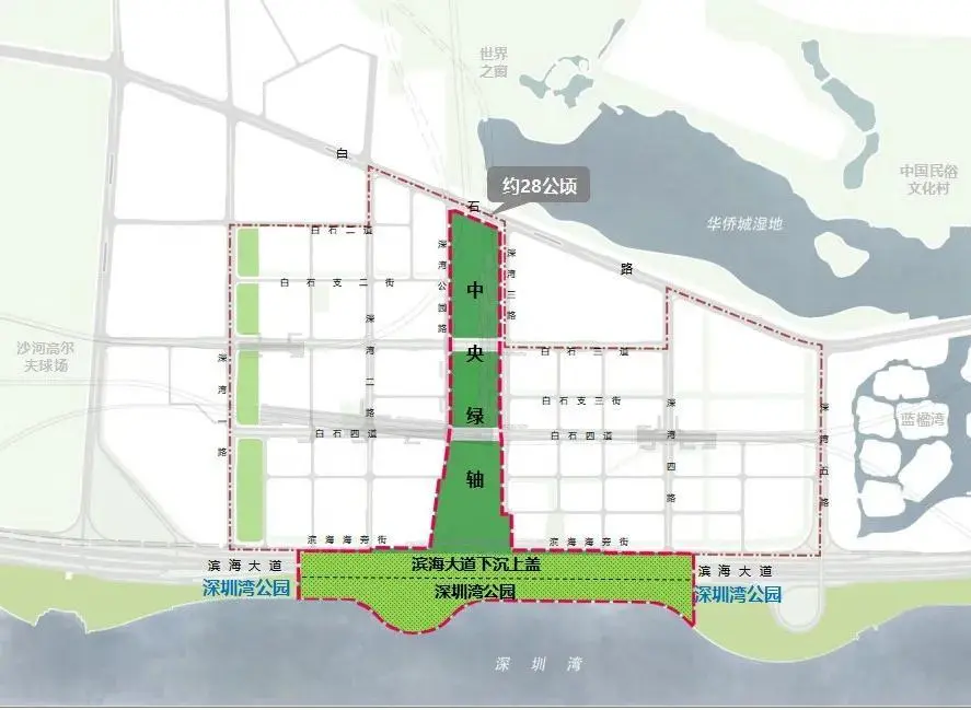 今年6月6日上午,該基地舉行中央綠軸項(xiàng)目開工活動(dòng),此次開工的中央綠軸項(xiàng)目南北全長約1.0公里,最大寬度達(dá)210米,是連接塘朗山——華僑城濕地——深圳灣“通山達(dá)?!钡暮诵目臻g軸線。隨著濱海大道深超總段下沉工程建設(shè),未來深超總紅線內(nèi)景觀將與深圳灣公園無縫銜接,共同構(gòu)成南北貫通的中央綠軸體系。